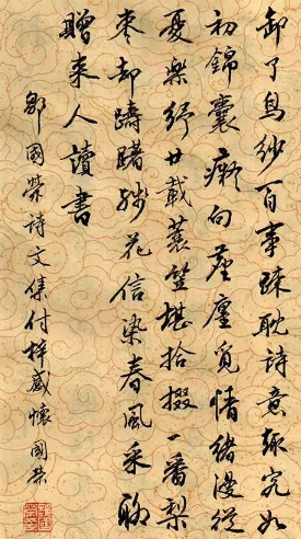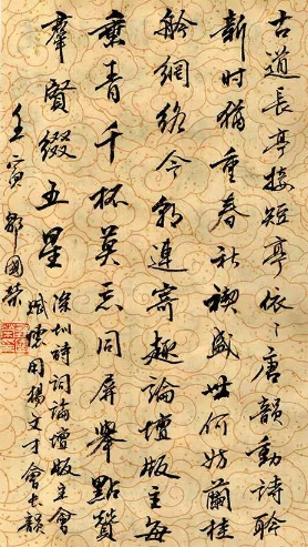 邹国荣,号无为斋主,中华诗词学会会员。香港诗词学会顾问、深圳市诗词学会名誉会长,中国北社诗社名誉社长。中国楹联学会书法委员会委员。深圳市楹联学会副会长。省、市书法家协会会员。中国国学协会会员。曾出版有诗词和书法专著。有大量诗词作品发表于报刊、杂志、网络及石刻。书法作品曾被全国各地许多碑、匾、楹联所刊刻和国内外所收藏。