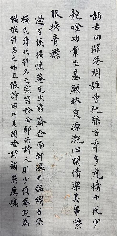 过百侯杨慎庵书斋企南轩,温丹铭谓:“百侯杨氏,清代科名之盛,冠于全郡,而诗人则少。”慎庵既为杨氏科名之始,且能诗,因用其《闲吟》诗韵