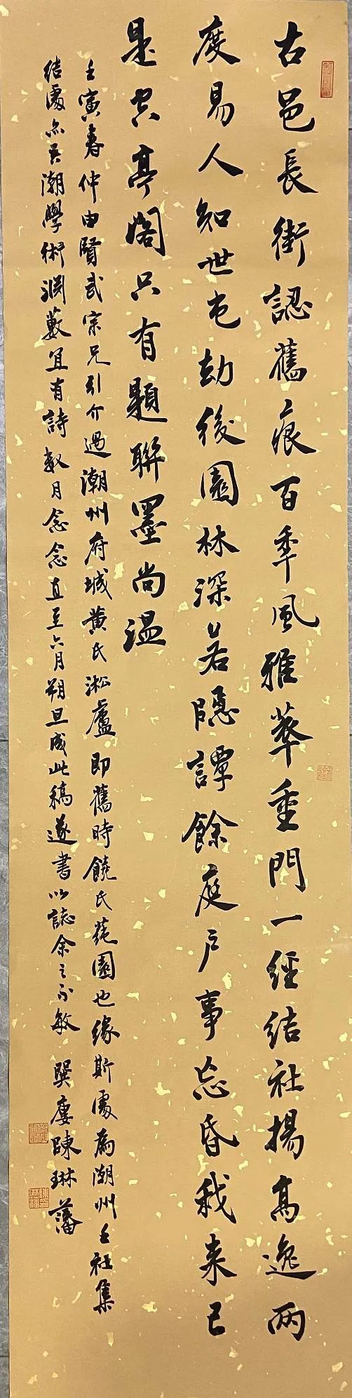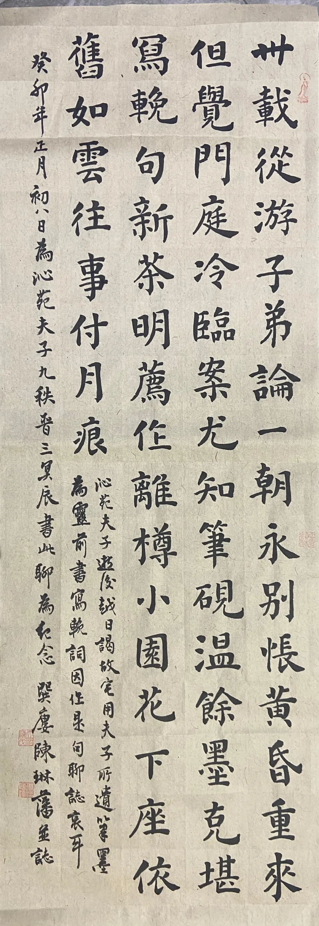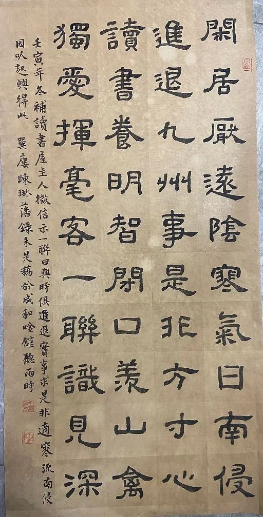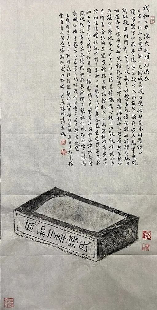 读书写字卅载奇,据案每发古人悲。提笔顾影空太息,笔秃砚新枉凝眉。同门郭舍收藏多,好凿古砖传砚歌。此砚赠我缘同姓,还添年号晋咸和。寒馆既添无上宝,顿增兴致寸心草。怜我早无功名谋,墨磨砚来人亦老。一时不慎竟摔断,伤心纸上亦散乱。修复好手有杨君,金秋约茶过寒馆。杨君胸襟余耿介,日为课徒惟书画。好古修物好情怀,虽耗心神力未惫。不日贶我佳消息,全器竟还拓墨色。精细工夫最报人,惹我好事题一识。郭杨两君籍庵江,与我合谈结邻邦。断砚既复重在案,再续诗兴兴未降。闲日聚叙任风雨,茶烟升腾过书窗。堪怜手艺不入书客目,呜呼哉,何时重见匠者读书并成双。