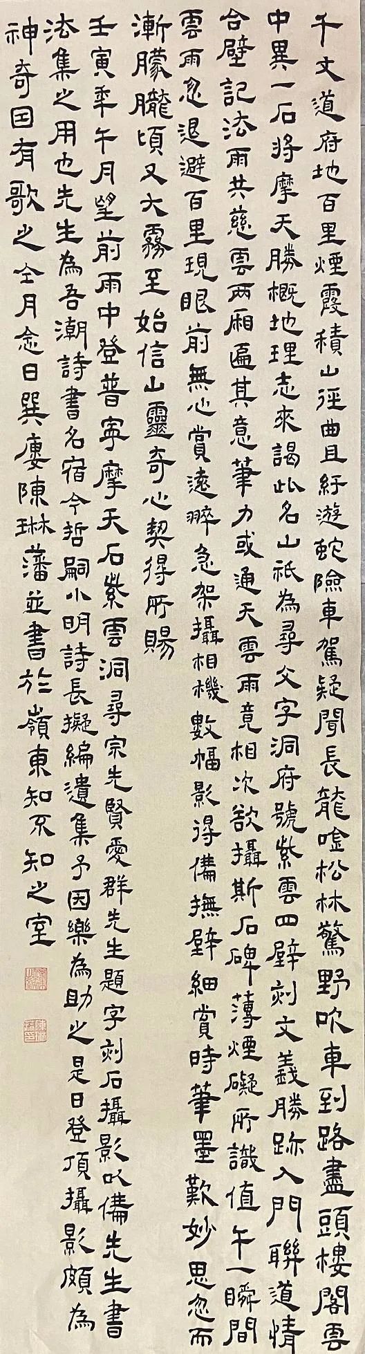 千丈道府地,百里烟霞积。山径曲且纡,游蛇险车驾。疑闻长龙吟,松林惊野吹。车到路尽头,楼阁云中异。一石将摩天,胜概地理志。来谒此名山,只为寻文字。道府号紫云,四壁刻文义。胜迹入门联,道情合壁记。法雨共慈云,两厢匾其意。笔力或通天,云雨竟相次。欲摄斯石碑,薄烟碍所识。值午一瞬间,云雨忽退避。百里现眼前,无心赏远翠。急架摄相机,数幅影得备。抚壁细赏时,笔墨叹妙思。忽而渐朦胧,顷又厚雾至。始信山灵奇,心契得所赐。