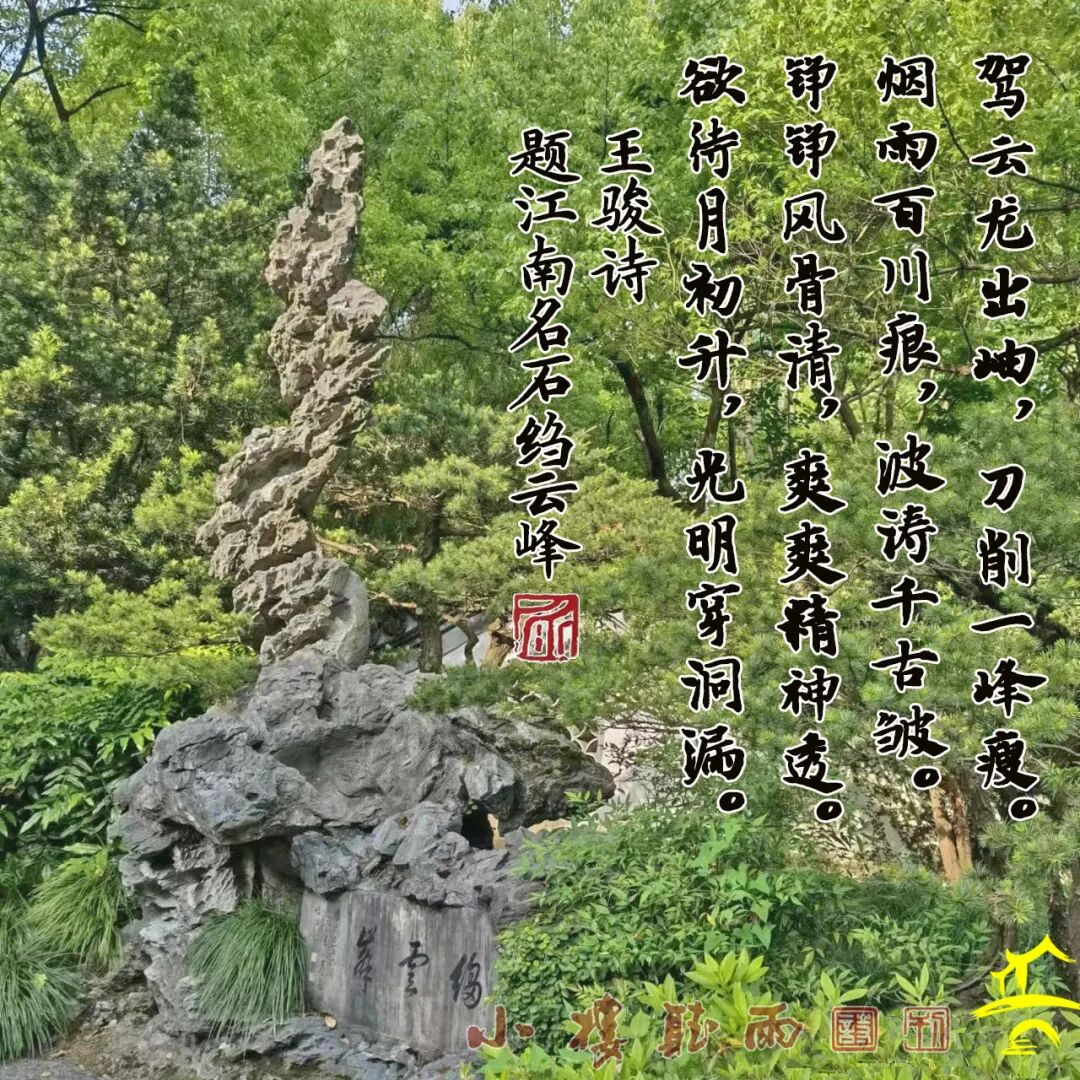 Inscription on the Famous Southern River Stone, the Crinkled Cloud PeakA dragon of clouds appears from the peak;A slender mountain, by a blade made sleek.Mist and rain leave traces of myriad streams;Waves of a thousand ages crease its seams.Its spirit clear as a resounding bell,Essence through, a refreshing tale to tell.As the moon begins to rise in the night,Its light pierces the peak, a splendid sight.