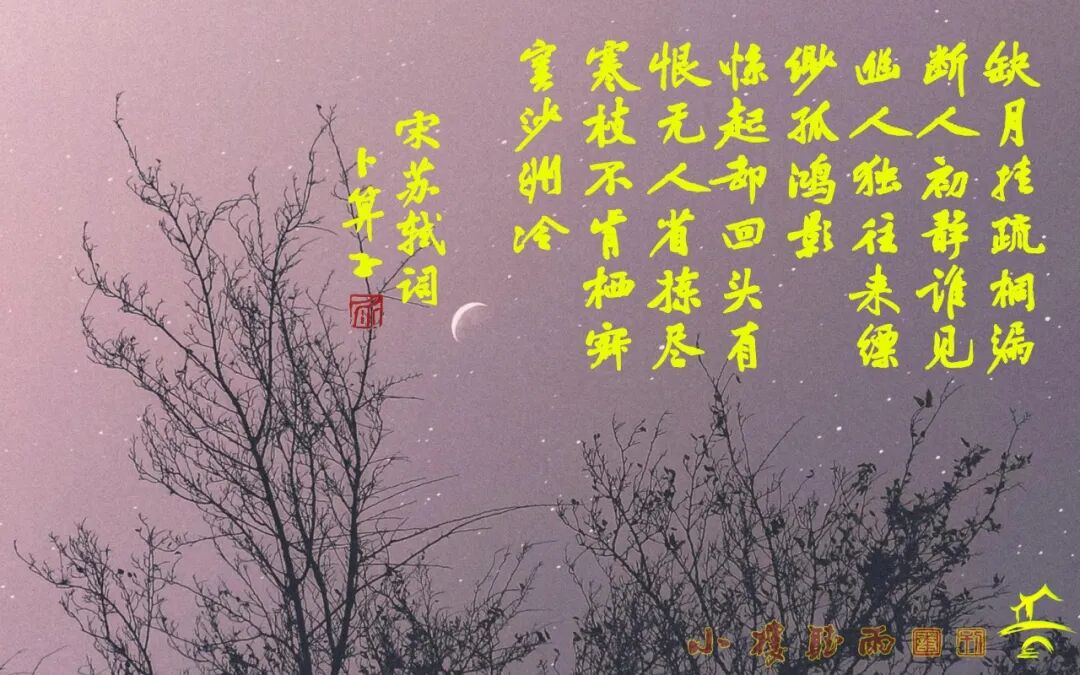 缺月挂疏桐,漏断人初静。谁见幽人独往来,缥缈孤鸿影。 惊起却回头,有恨无人省。拣尽寒枝不肯栖,寂寞沙洲冷。