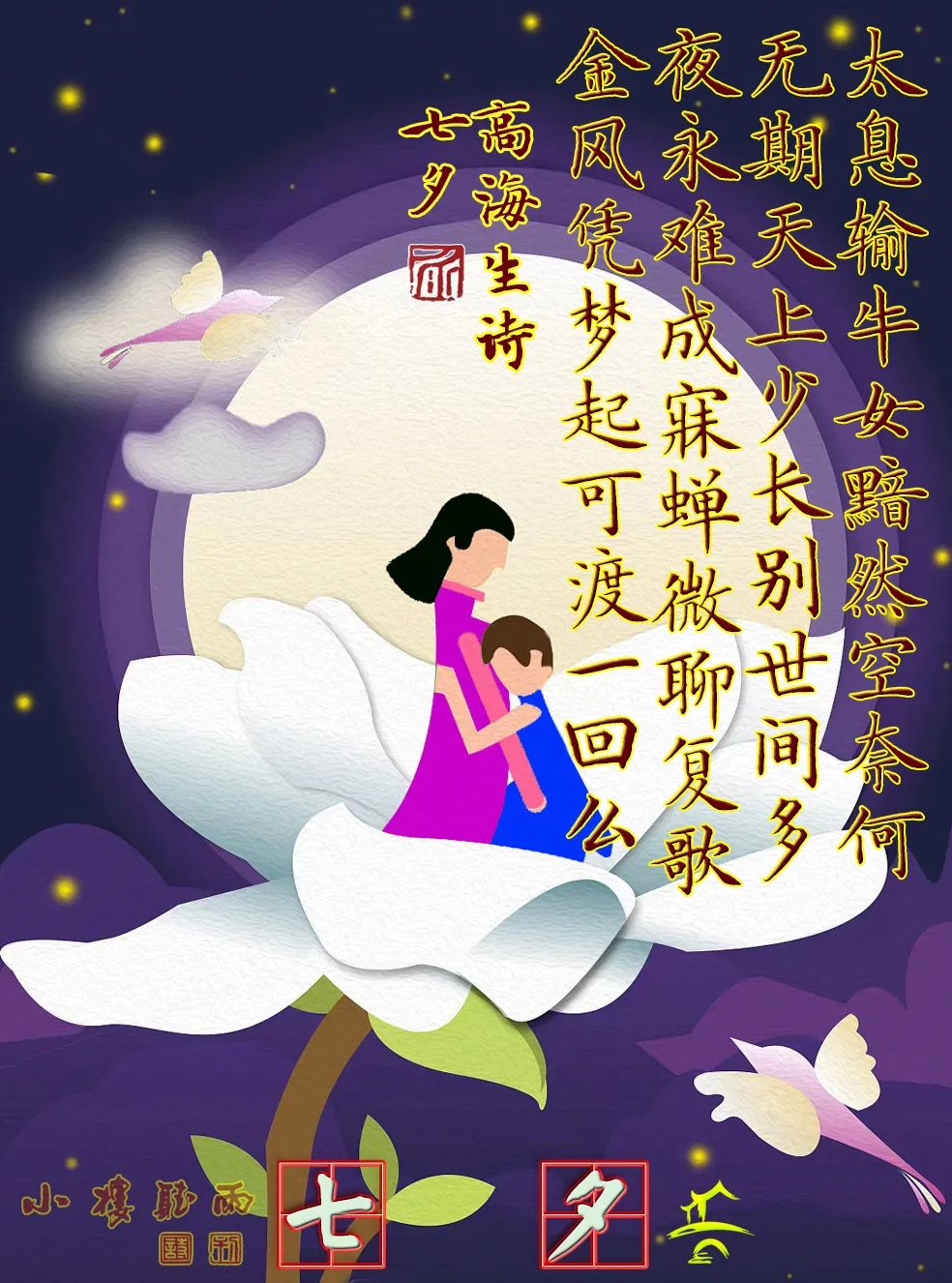 How do Cowherd and Weaver go?They’re left in gloom, O helpless woe!They meet so scarce in the Milky Way;Apart on earth, for long they stay.They cannot sleep, the night so long;Cicadas shrill their autumn song.Can golden wind from their dream rise,So they could wade across the skies?