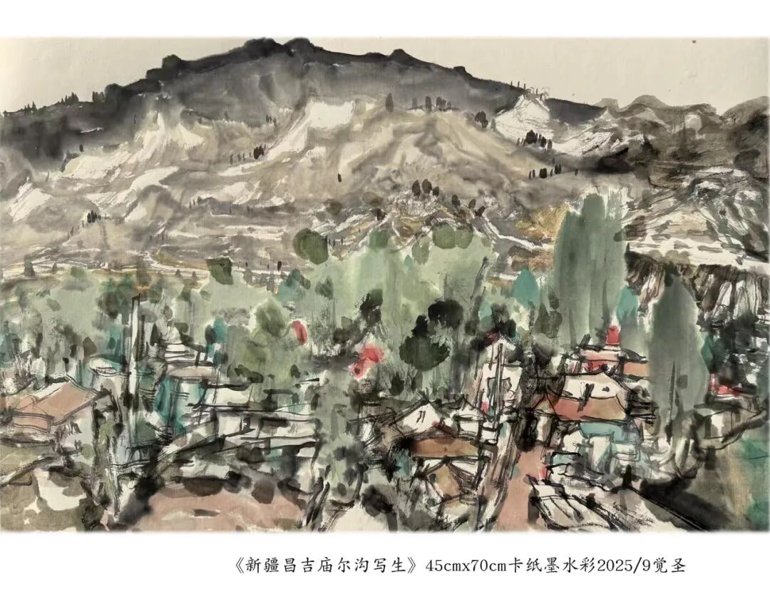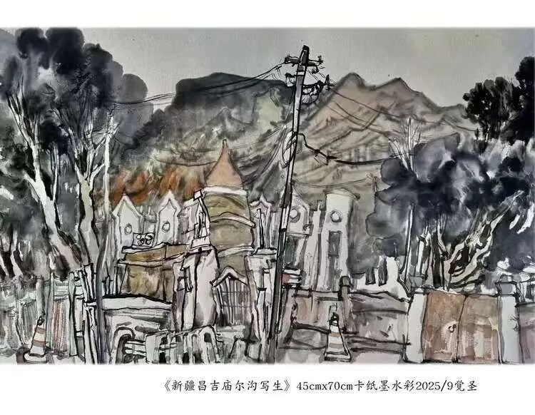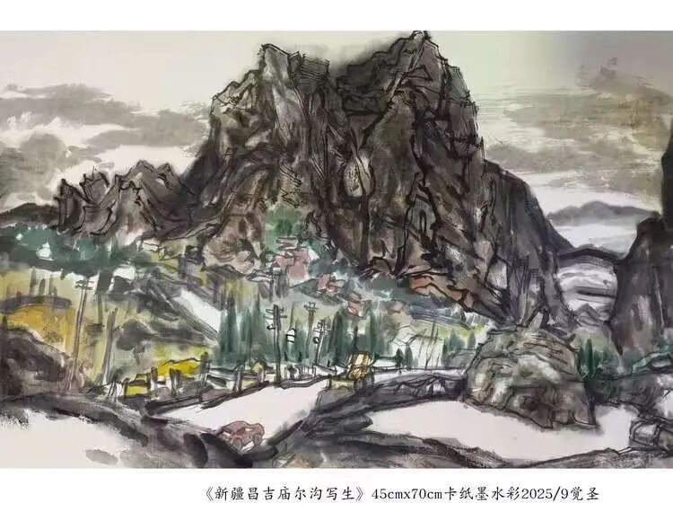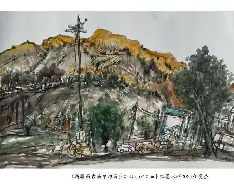 我在不断地变换着我的写生方式和面貌,我是一个不喜欢墨守成规的人,昨天写生的过程中,新疆乌鲁木齐的年轻画家许剑,问了我一个问题,问我画的写生是水墨,还是水彩?我说既不是水墨,也不是水彩,既是水墨,又是水彩,其实我并没有用一种固定的模式去画写生,因为我不喜欢用所谓形成的固定模式去套你眼前不一样的风景,写生岀来的东西,东,西,南,北都一个样,没有区别,记得韩总在接我们的车上说过一句话,还没画家把新疆这里特殊的地貌,地形,地势表现的那么准确到位,我听后在想,难道没有画家研究过新疆山水的脉络?吃晚饭时小许把他创作的许多作品拿给我看,看得出他是一个非常勤奋的小伙子,画了许多各种样式的作品,涉猎的范围包括雕塑,版画,国画,水彩,油画,兴趣点非常多,每一类的作品搞得还不错,我告诉他只是不能太分散,人的精力有限,太分散了就不容易“精”,他也同意我的观点,他告诉我,他现在主要以雕塑为主,他的雕塑和版画好于他的水墨部分,特别是有一些版画作品,抽离了写实的那一部分,作品就显得高级,过于写实会把他带到非常不自由的一种境界,这也是目前他需要急待转化,转变的一个方向,昨天下午他陪着我画了三张写生,我放松,随性,自由自在的一种状态,应该对他今后的创作有所启发,这也是我希望看到的,也算是我俩一下午的相互陪伴最好的一种结缘方式,我的新疆写生第三集,第四集,有两段跟拍都是小许完成的,他让我的视频又多了一个新的视角。今天有点阴天,天气预报说好像还有小雨,我心想着,千万别下雨,我把每一次外出写生的时间都很珍惜,我不想把外出时间浪费在写生以外的其它事上,常年在外写生养成的一种习惯,要么写生,要么整理写生,要么纪录写生随笔,要么把随时记录写生的视频剪辑成片,这一套活下来,基本上做其它事也就不可能再有时间,它甚至还占用我吃饭、睡觉的时间来完成每天按部就班的这套工作,年复一年,日复一日,几乎没有停顿过,它占据了我绝大部分的时间,关键是我热爱,喜欢,乐此不疲这样的一种生活状态。其实每次写生,眼前的景致对我来说,我不是太注重选择,我常说处处可以画,处处可入画,早已过了到处选来选去的阶段,昨天和乌鲁木齐的年轻画家小许还聊到此事,我告䜣他,眼前的景致只是画家抒发情绪和对世界认知的一种载体,并非你看到什么就画什么的一个初级阶段,画家的感受很重要,如果没有这种对眼前的景物敏锐的感受力和艺术层面的转化能力,那么写生出来的东西一定是直白,没有内涵且没有生命力的一种简单重复与简单模仿,不知道这种写生有何意义,每次来新疆都把自己都累得够呛,此行也不例外,但每次都保持着对写生的一种高度热情和兴奋状态,能做到身累心不累,恢复起来就很容易,愿《椤严神咒》时时加持。