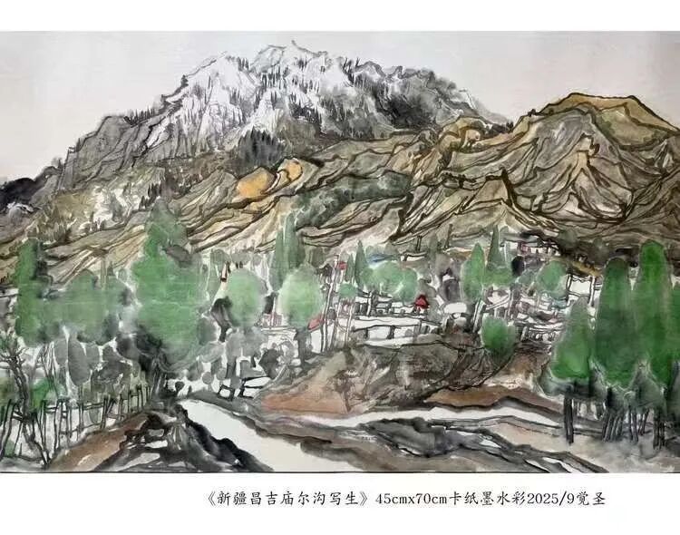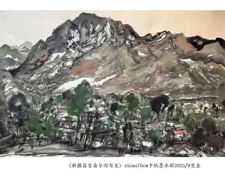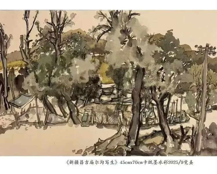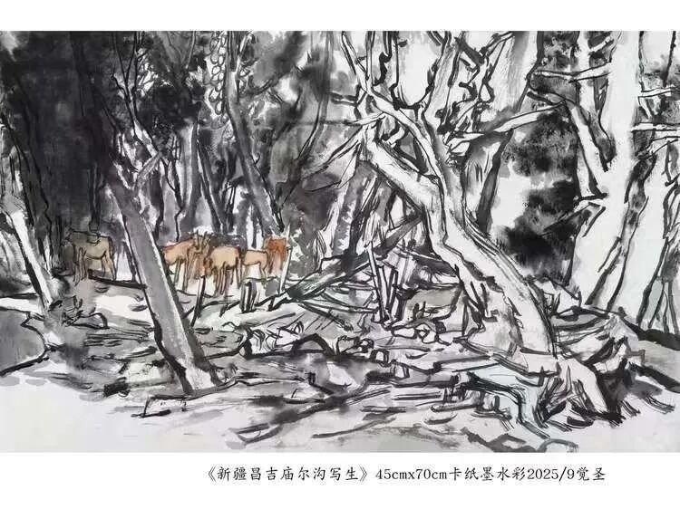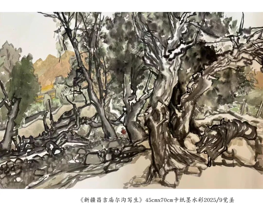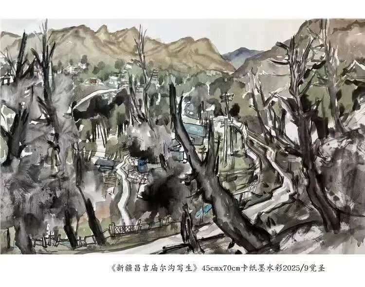 九月中旬的昌吉庙尔沟,早晚温差很大,今天早上天还没亮,一个人穿着防寒服沿着山路走了很远,风是寒的,大概六七度的样子,一直是上坡的路,走的全身微微出汗,七点四十左右,天才大亮,路上有了行人,看穿戴猜想大概是附近工地上的工人,一边打着招呼一边问了一下周边的情况和气温,八点半早餐,十点半才出发写生,选在这个时间点也是为了暖和,写生时不至于出不了手,画了一会,暖暖的阳光就洒在了脸上,身上,它不是直射的那种,而是暖阳阳的非常舒服,画到午饭前,完成了二幅,还是用了生熟二种不同的纸,出来的效果和处理的手法皆因纸的不同而自然变换,中午吃饭时己经一点多钟,定好休息到三点半出发,结果大伙可能是上午画的疲劳,四点多才出发,今天写生的地点是谢家沟,离驻地很近,下午三个半小时的写生,画了三幅,每次外出写生都是争五保四,今天算是完成了任务。 十九号那天我们去到沟里的一片树林,各种各样的,几百年的,活着的,枯死的树,树林中有一个小马厂,养了很多母马,树荫下写生,一会就冷的不行,这次到新疆,写生的样式与面貌突然有所改变,用了很多水彩的方式,一改以往的勾线设色为主的表现手法,这可能与新疆特有的地貌有关系,我发现用传统的方式很难把新疆的地貌特征表现出来,当然我也只是偿试,也还没有完全表现出新疆特有的一些特征,油画,水彩的语言可能描述它更准确一些,五色斑斓的色彩用墨线去表现似乎差了些味道,实际上用中国画的方式如何去写生天山,是此次摆在内地画家面前的一个新课题,需要用大量的时间去不断的试验研究,不断的探索,其实每一次写生都是在实践着你对每一处新地方认知的反馈。