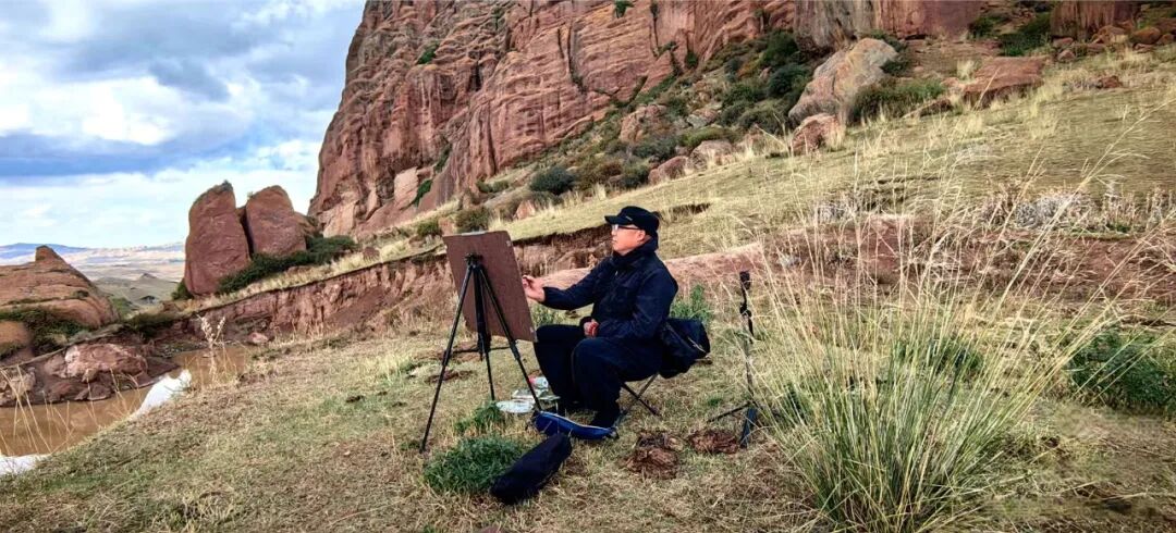 今天9月20日,早上7:00多出门,天还灰蒙蒙的,没有完全亮,背上写生工具,在黑色中走了一会,有了点能见度,开始准备写生时才发现没有拿凳子,没有带水,犯了个低级错误,刚坐下,几条大型的犬围着我转了两圈,看到它们脖子上的圈,知道是圈养的,但还是警惕的拿起了自拍杆,怕有意外的发生,还好,它们嗅了两下就走开了,定定神,开始工作,找了一个大的卵石,当凳子用,但越坐越凉,垫了块东西好了许多,这是我第一天来到这里,就侦查好的一块地方,昨天没能出院门,所以没画成,每次的写生,我试图打破我原有的一些东西,形成固定的,守了很久的,没有能力破的,这世界就没有一成不变的东西,所以说绘画也是如此,面貌是守不住的,就是人们常说的,所谓的绘画语言与样式都会在感受中不断的变化着。我和小许说想找到一个做礼拜的清真寺,上山的路上似乎我们都看到过,他帮我拿着写生的工具,我们一边走一边找清真寺,想着画一幅以清真寺为前景的一幅写生,找了半天也没找到,看到了一座幼儿园,索性就在马路边支起了架子,于是乎,第一天的第五幅写生完成。我习惯当天的事当天了,不习惯拖到第二天,今天的做好的第五个视频,只当我每天写生的一个记录,它记录着辛苦,也记录着众多的美好。韩总接我们的那天晚上,沿途经过的精彩地段被黑暗淹没,几乎什么也没看到,自然对周围环境一点不知,今天下山从庙尔沟去玛纳斯的路上才发现,这里到处都可写生,每转过一道弯,就有不同的景象,天山山脉的每一处都充满神秘的气息,风景如画一点不夸张,从高处盘璇到一马平川,到了昌吉附近,路二边的棉花还没有采摘,白棕相间的颜色从车边穿过,从高山到平原,又进入高地,一百多公里的路程开了三个多小时,好一点的路都限速在八十,这个速度恰巧适合慢慢欣赏路二边的美景,进入玛纳斯山体出现了一块沉稳的红色,漂亮之极,今天写生选在五道崖,这里的地貌是从平坦的山坡冒出来五个形状各异,大小不同的山头,看似不大,走进去人一下子就淹没在山石中,昨天写生选在了半山坡一块平整的草地上,微微有点风,坐下来画时没觉得,后来越画越冷,昨天的写生其实没完成,最后身体告诉我,必须立刻马上收摊,马上爬爬山把身体里的寒冷之气赶跑,非常果断明智的一个举动,最后证明是正确的,这个季节来新疆写生,一定要把保暖的衣服带好,景致再美也别忘了随时保暖,保护好身体永远是第一位的。去吐鲁番写生的视频还没做完,又接上了再次返疆昌吉的写生,上个月的吐鲁番在我们写生期间的温度一直保持在45度左右,像新疆朋友的热情一样,似火一般,这次昌吉的温差早晚却很大,一会冷一会热,必须随时增减衣服。昌吉的地貌和吐鲁番的地貌完全不同,这里宣传的力度显然不够,没来之前我孤陋寡闻,对此地楞不知道,这里大山层峦叠嶂,一层一层的环抱着,它没有北方山石的结构,但却有它独特,特殊,气势磅礴巨大的走势,这个季节的山势通体金黄色中带着深绿色的斑点,远看每一处的斑点走到近前都是巨大无比直刺蓝天的松树,人在其中微尘一般,这种宽广的群山可包容万物,所有的动植物都以自己的方式繁衍生息着,生态环境保护的非常好,重要的一个原因就是没有开发,没有多少人知道,写到这,想起这二天的一个热点,蔡国强借艺术之名炸喜马拉雅的新闻,真是可恶之极,不可原谅,要想画好这里,需要待在这里一段时间,像我们这样,还没画热乎就离开了,怎么会画的好,时间太短就只能走马观花,初步感受一下,听秦天星主席讲,这几年内地来此地写生的人越来越多,希望找机会再去,深度画一下。